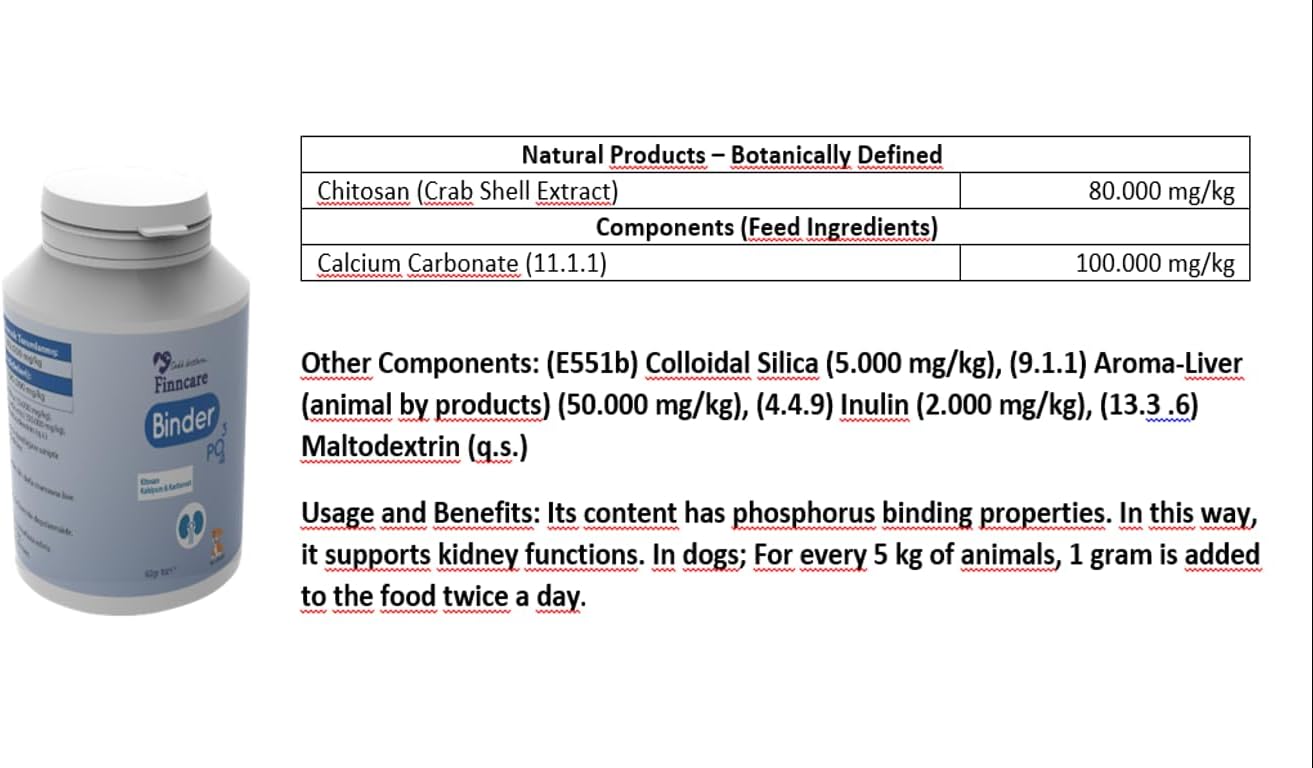 Chitosan , Chitosan for dogs is used to support kidney functions. It binds with phosphorus in the body, limits its absorption and supports healthy kidney function.